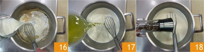 Now prepare the béchamel sauce: heat the milk, and in the meantime, melt the butter in a saucepan 13. Once melted, add the flour all at once and stir quickly with a whisk 14 until you get a golden mixture, the roux 15.