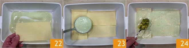 You are ready to assemble the lasagna: spread a layer of béchamel on the bottom of a 8x12 inch baking dish, then lay down the pasta sheets 22 and cover with more béchamel 23. Distribute some of the sautéed asparagus 24.