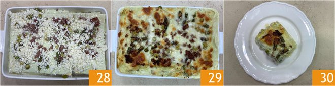 Once the final layer is completed 28, bake the lasagna in a static preheated oven at 355°F-375°F for about 40 minutes 29. When the surface is nicely golden 29, remove from the oven and serve your lasagna with asparagus and sausage 30!