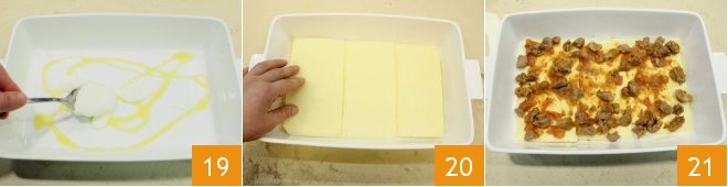 and start assembling the lasagna: grease a 9x13 inch rectangular oven dish with olive oil 19, spread a layer of pecorino béchamel, distribute the pasta sheets 20, and top with the lamb ragout 21