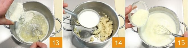 In another saucepan, melt the butter, add the flour while whisking 13 until the mixture thickens, then pour in the hot milk 14 and, still whisking, incorporate the grated pecorino cheese 15.