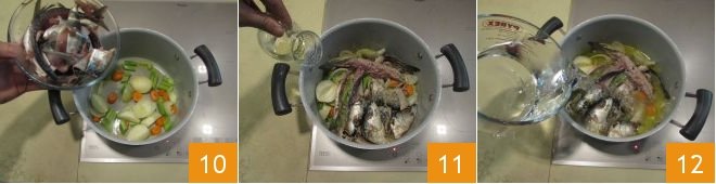 Sauté them for 1-2 minutes with a drizzle of oil in a large, high-sided saucepan. Then add the fish scraps 10. Sear the ingredients for 1 minute and deglaze with wine 11. When it has completely evaporated, pour in the water 12 and let it cook over moderate heat for 20 minutes.