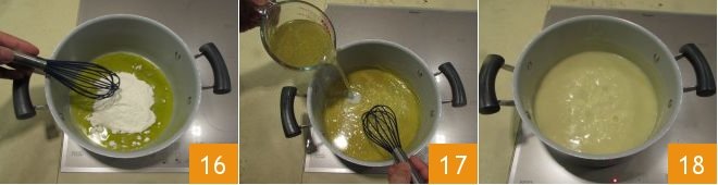 Proceed with the preparation of the béchamel: in a high-sided, non-stick pot, heat the oil and sprinkle in the flour 16, stirring the ingredients vigorously with a hand whisk. When you have created the roux, add the fish broth 17, continuing to stir to prevent lumps from forming. Let it cook over moderate heat until it almost reaches a boil to allow the béchamel to thicken 18. When it has reached the right consistency, turn off the heat, pour it into a bowl applying plastic wrap in contact to prevent the formation of a crust on the surface, and transfer it to the refrigerator to cool.