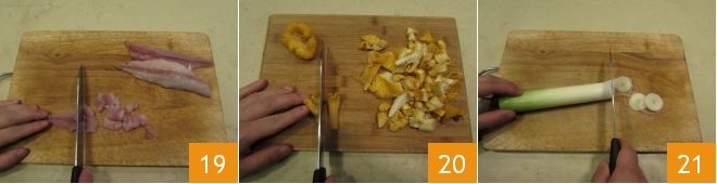 Now prepare the lasagna filling: cut the mackerel into not too large chunks 19, the chanterelles into thin slices 20, and the leek into thin rounds 21.