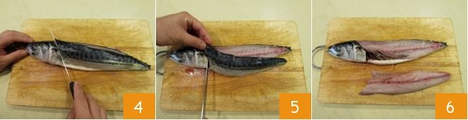 Now make a clean cut at the head 4. Incise the dorsal part of the mackerel and, starting from the tail, slide the blade horizontally to the work surface 5 to detach the first fillet 6. Turn the fish over and perform the same operation on the other side: thus you will get the second fillet.