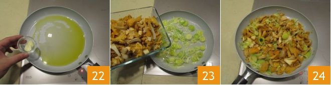 Heat the oil in a non-stick pan and sauté a clove of garlic 22. When it has turned golden, remove it and add the leek, stirring it occasionally to ensure it wilts evenly. Then pour in the chanterelles 23, seasoning with salt and pepper. Let it cook over moderate heat for 6 minutes and, once ready, set them aside 24.