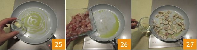 Then take another non-stick pan and sauté a clove of garlic with a drizzle of oil 25: remove it when it is golden. Then add the mackerel chunks to the pan 26, cooking over moderate heat. Season with salt and pepper, finally deglaze with white wine 27.
