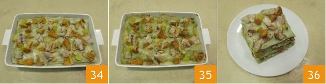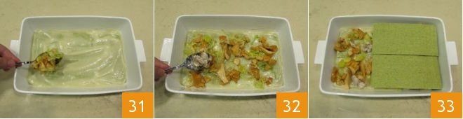 Then create a new layer of béchamel and distribute the chanterelles evenly over the surface 31. Add the mackerel chunks also evenly 32. At this point, take some more lasagna sheets and place them in the pan in the opposite direction to the first layer to ideally form a woven pattern 33.