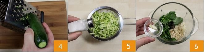 While the confit cherry tomatoes are cooking, focus on the Zucchini pesto: grate the zucchinis 4, place them in a colander, add salt to help them lose excess liquid 5. Meanwhile, put the basil leaves, almonds, pine nuts, extra virgin olive oil, and garlic in the food processor 6.