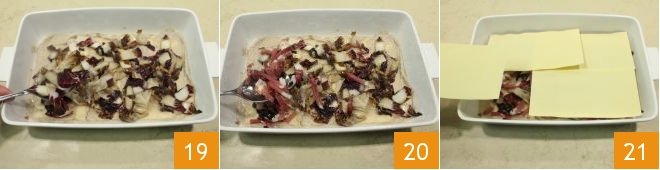 then add the radicchio 19 and the speck 20. At this point, place 4 pasta sheets on top in the opposite direction 21