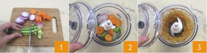 To prepare the seitan ragù, start by preparing the vegetables for the classic aromatic base. Peel the onion, celery, and carrot; cut them into large pieces 1. Place everything in a food processor 2 and blend until you get a very fine mixture 3.