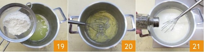 And when it's melted, remove it from the heat and add the sifted flour 19. Stir vigorously with a whisk 20 to obtain a lump-free mixture (the roux). Then put the pot back on the heat to lightly brown the mixture. Add the hot flavored milk and stir vigorously with the whisk 21; let it thicken, cooking the béchamel over low heat for 5-6 minutes, stirring often.