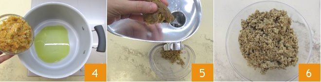 Heat the oil in a large pan and add the aromatic base 4. Let it sauté over low heat for at least 15 minutes, stirring occasionally, until the mixture is dry. Meanwhile, take care of the seitan. Insert it gradually into a meat grinder 5 to obtain a mince 6. If you don't have a meat grinder, you can finely chop the seitan with a knife.