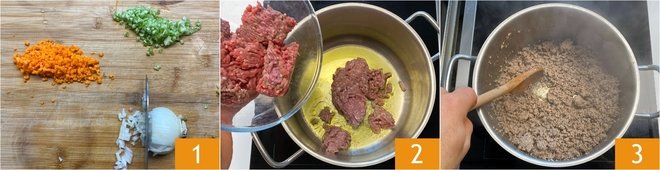 To make the lasagna without béchamel, first prepare the ragù: clean and finely chop the celery, carrot, and onion 1. Heat a splash of oil in a saucepan, then add the ground beef and pork 2 and brown over high heat until the liquid has evaporated 3.