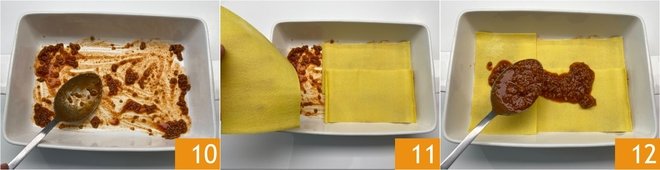 After the ragù cooking time has elapsed, you can assemble your lasagna: take a 8x12 inch baking dish and spread a layer of ragù on the bottom 10, then lay 3 lasagna sheets 11 and cover with the ragù 12.