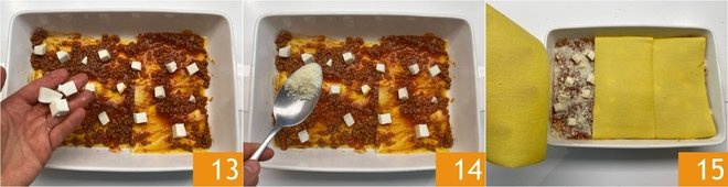 Distribute some mozzarella cubes 13 and grated Parmigiano Reggiano PDO 14, then form another layer of lasagna 15 and continue alternating the ingredients in this order until you have 4 layers in total.