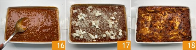 Finish with a generous layer of ragù 16, mozzarella, and grated cheese 17. Bake in a preheated static oven at 392°F for about 20 minutes, then turn on the grill and continue cooking for another 10 minutes. Remove from the oven and let it rest a few minutes before serving your lasagna without béchamel 18!