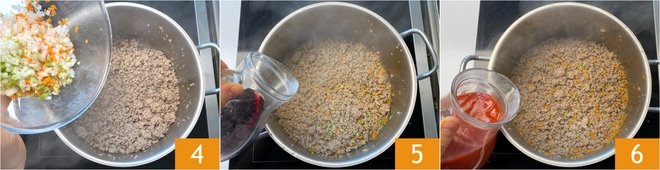 At this point, reduce the heat and add the chopped vegetables 4. Let the soffritto soften for a few minutes, then raise the heat again and deglaze with the red wine 5. Once the alcohol has completely evaporated, add the tomato puree 6.