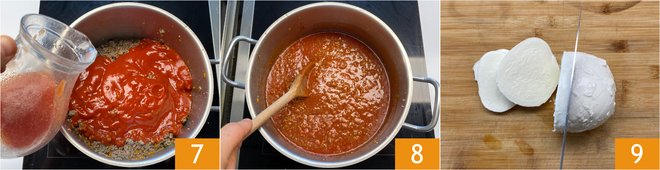 Add a little water (just enough to rinse the pitcher) 7, salt and cook over low heat for 45 minutes 8; at the end of cooking, you should have a fairly liquid ragù. Meanwhile, cut the mozzarella into cubes 9.