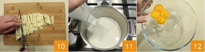 Now focus on the filling: chop the white chocolate 10, then place a saucepan with the milk on the stove 11 and bring it to a boil. Meanwhile, place the yolks in a bowl 12,