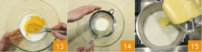 add the granulated sugar and mix with a whisk 13 until you get a light mixture, incorporate the sifted flour 14. Pour the resulting mixture into the hot milk 15