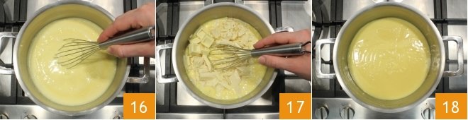 and continue stirring 16 as you add the chopped white chocolate 17, continue cooking over low heat until the cream thickens. When the cream is ready 18,