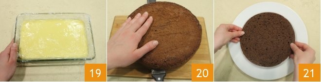 transfer the cold cream into a piping bag with a smooth nozzle 22 and fill the first layer of sponge cake with the cream 23. Cover with a second layer of sponge cake, fill again with the cream, and close with the third layer of cocoa sponge cake 24.