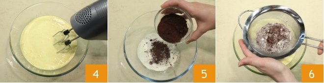 until you get a light and fluffy mixture 4: it will take at least 10 minutes. In another bowl, gather the flour, cocoa powder 5, and potato starch. Sift the dry ingredients and collect them in the bowl containing the egg mixture 6,