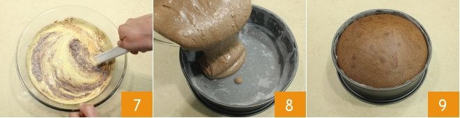 mix with a spoon 7 to combine the ingredients. Pour the mixture into a 9-inch (23 cm) diameter cake pan greased and lined with parchment paper 8. Bake the sponge cake in a preheated static oven at 356°F (180°C) for 45 minutes (if using a convection oven, bake at 320°F (160°C) for 35 minutes). Once cooked, remove the pan from the oven 9 and let it cool before removing the cake from the pan.