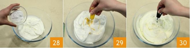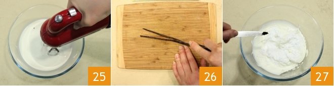Now focus on the decoration: whip the cream with an electric mixer 25, cut a vanilla pod lengthwise, use a knife to extract the seeds 26 and add them to the freshly whipped cream 27.