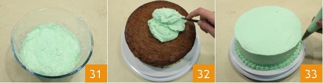 Add the powdered sugar to the cream when it is semi-whipped 30 and then color it with a few drops of yellow food coloring 31 and a few drops of blue food coloring 32 until you achieve an aqua green color.