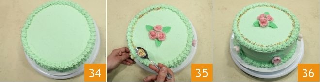 and around the entire perimeter of the surface 34. Take the flower-shaped decorations, apply them to the edge and center of the cake, creating a pretty floral pattern. Take the colored balls and use a teaspoon to distribute a strip around the entire edge 35. Your layered filled cake is ready to be served 36.