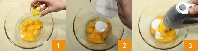 To make the layered filled cake, start with the base mixture: place the whole eggs and yolks in a bowl, add the honey 1, then add the granulated sugar 2 and whisk with an electric mixer 3 (or a stand mixer)