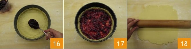 Place 1/3 of the jam inside 16 and spread it over the entire surface of the tart 17. Take another portion of dough and roll it out to a 1/5-inch thickness 18, then cut another 10-inch circle to place over the jam, pressing the edges against the pan.