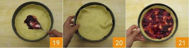 Cover with half of the remaining jam 19. Then cut out a final 10-inch circle of dough, also 1/5 inch thick, and place it on top as before, pressing the edges against the pan 20. Spread the remaining jam over the tart 21.
