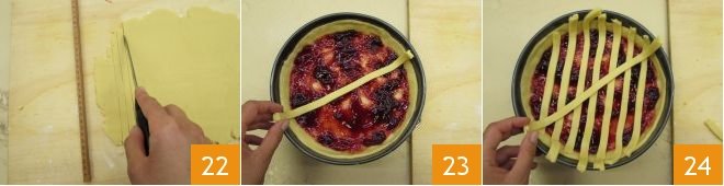 Take the last portion of dough, roll it out to a 1/5-inch thickness, and cut strips 0.4 inches wide and slightly longer than the tart diameter 22. Place the first set of strips 23 parallel to each other, spacing them out. Rotate the pan and make a second set of strips, weaving them over the first set 24.