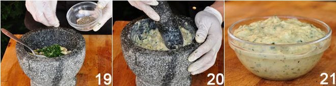 chopped garlic, mint (add only at the end if using the mixer), salt, and pepper 19. Mash 20 or blend everything to combine the ingredients. You can choose to achieve a coarse texture or a smooth emulsion. In this case, we preferred a coarse texture to give the dish rusticity 21.