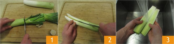 To prepare the leek and potato cream with bacon, start by cleaning the leeks. Cut off the greenest part and trim the root base, cut lengthwise in half 2 and rinse under running water 3.