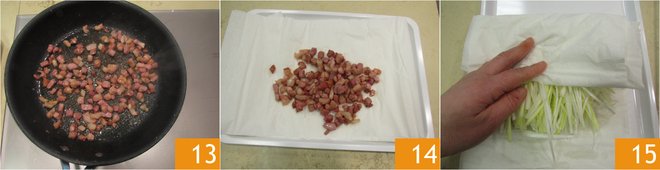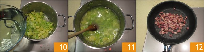 Sauté for a few minutes, adding a pinch of salt, and cover with broth 10. Cook for about 30 minutes from boiling 11. Now attend to the bacon, pour it into a non-stick pan 12.