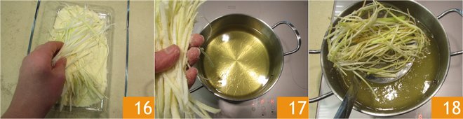 and sauté over medium heat until it becomes slightly colored and crispy 13, place it on a tray with absorbent paper to dry excess fat 14. Meanwhile, heat seed oil in a high-sided pot. Drain the sliced leek from the ice water, dry it well with a cloth 15.