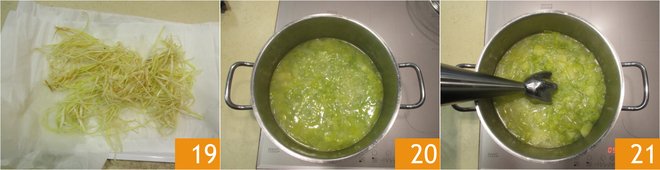 Dry the fried leek well on absorbent paper 19. Once the cooking of leeks and potatoes is finished 20, adjust with salt and pepper and blend the mixture 21 adding 1.4 oz of extra virgin olive oil.