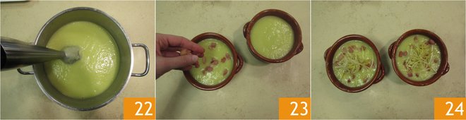 until it results in a smooth cream 22. Serve your cream in a soup plate and garnish with crispy bacon cubes 23 and fried leek 24.