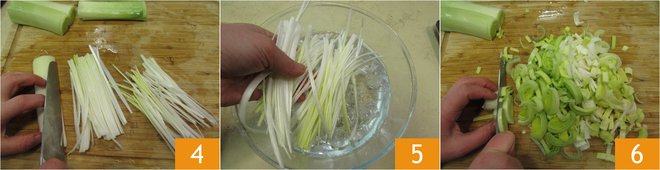 Now cut the leek into a “log” of about 6 inches, thinly slice this piece lengthwise to obtain thin sticks 4, which you will immerse in plenty of ice water 5. At this point, cut the remaining leeks into small pieces of roughly equal size 6.