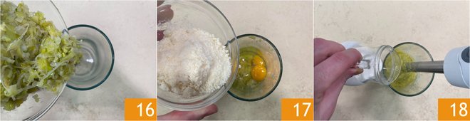 Retrieve the cooked leeks, pour an amount equal to 10.6 oz 16 into a tall glass, add the eggs 17, grated Parmigiano Reggiano 17, and blend to combine. Now add cream and milk 18.