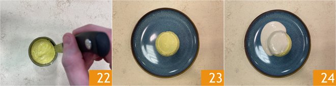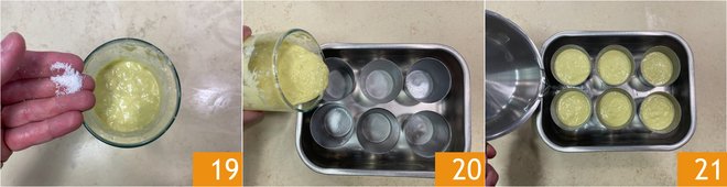 Salt the mixture 19. Butter six 5 oz molds and place them in a baking dish, pouring the mixture 20 without filling it to the edge 20. Pour boiling water into the baking dish to cover halfway up the molds 21. Bake in a preheated static oven at 320°F for 35 minutes.