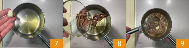 Meanwhile, prepare the anchovy sauce: in a small pot, pour a drizzle of oil and a clove of garlic 7, let it infuse over low heat, and as soon as the garlic starts to sizzle, add the anchovies 8. Stir with a whisk and cook over low heat to melt them 9.