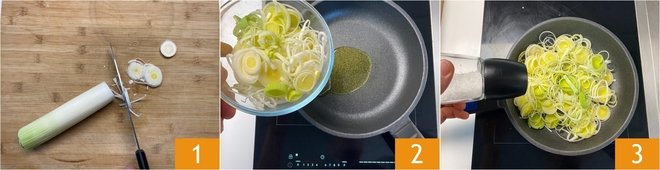 To prepare the leek omelette, start with the leeks. Trim them by removing the outer leaves, the green part, and any roots; then cut them into slices about 1/16 inch thick 1. In a pan, 11 inches in diameter, heat a drizzle of oil, then add the leeks 2 and season with salt 3.