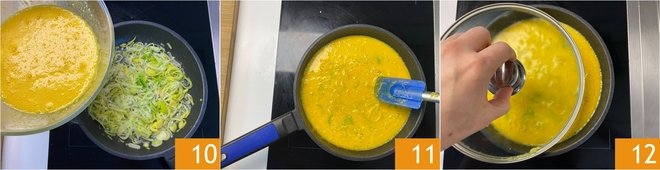Pour the mixture into the hot pan with the leeks 10, then distribute the eggs evenly with a spatula 11 and cover with a lid 12.