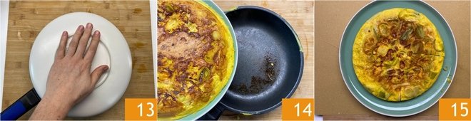 Cook over medium heat for 15 minutes, then flip the omelette with the help of a plate 13 and place it back in the pan 14. Cook on the other side for 7 minutes, slightly lowering the heat. Transfer the leek omelette to a serving plate and serve 15!