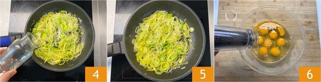 Sauté the leeks for about 6 minutes over medium heat, adding a little water halfway through cooking to prevent them from burning 4; they should be golden and well softened 5. Meanwhile, in a bowl, pour the eggs and season with salt and pepper 6.